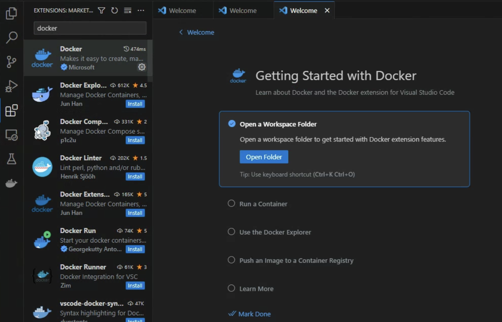 왼쪽 extension에 docker 탭을 보시면 왼쪽에 컨테이너가 보입니다.