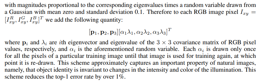 그리고 위 문단에서 alpha 를 전체 이미지가 한번 훈련하고 다시 사용될까지 사용하고 바꾼다고 하여서, epoch 별로 alpha 를 다시 sampling 하면서 학습하게 하였습니다. 이렇게 바꾸게 되면 얻는 효과는 RGB의 intensity 가 바뀌어서 색이 바뀌게 됩니다. (아래 사진은 alpha =0.5 일때) 이러한 augmentation가 top-1 error 를 1 % 올린다 하였습니다.
