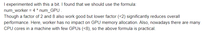 num_worker 는 gpu * 4 로 놓고, 로더를 작성합니다. https://discuss.pytorch.org/t/guidelines-for-assigning-num-workers-to-dataloader/813/4 (여기 참조)