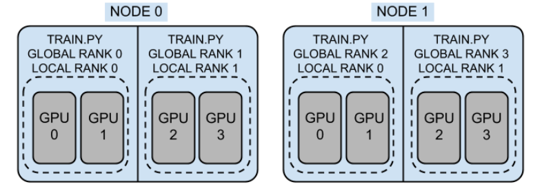 예를들어 아래 그림에서는 node가 2이고 world size 4, local world size : 2, global rank [0, 1, 2, 3], local rank : [0, 1] 으로 볼 수 있습니다.