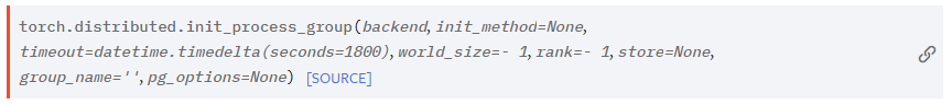 torch.distributed 를 사용하기 위해서는 초기화를 해야 합니다. 이를 위해 torch.distributed.init_process_group 이라는 함수를 이용해야 합니다. 이는 분산 패키지와 기본 분산 프로세스 그룹을 초기화 합니다.