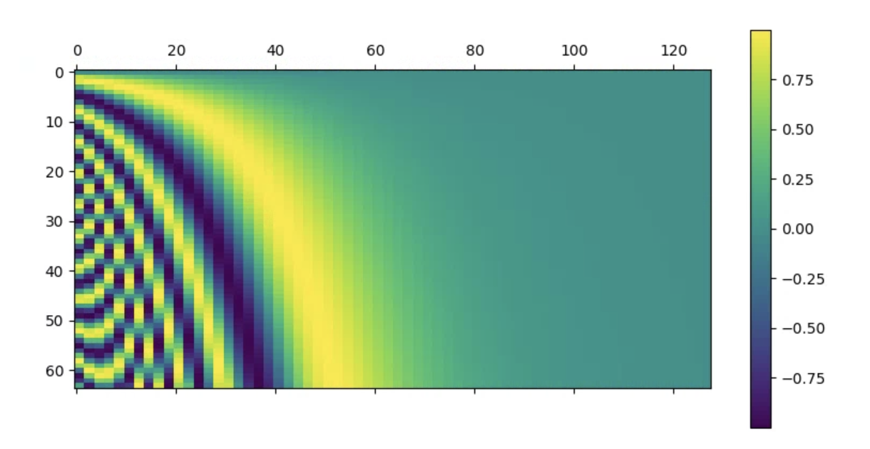 예를들어 d_model = 128, 이라고 가정하면 0번 pos 에는 첫번째 vector의 element가 sin(0 / (10000^0/128)) 이고,