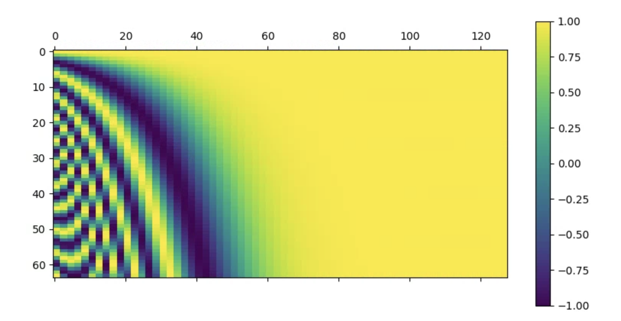 pe[..., 1::2] = pos.cos() # [64, d_model / 2]
