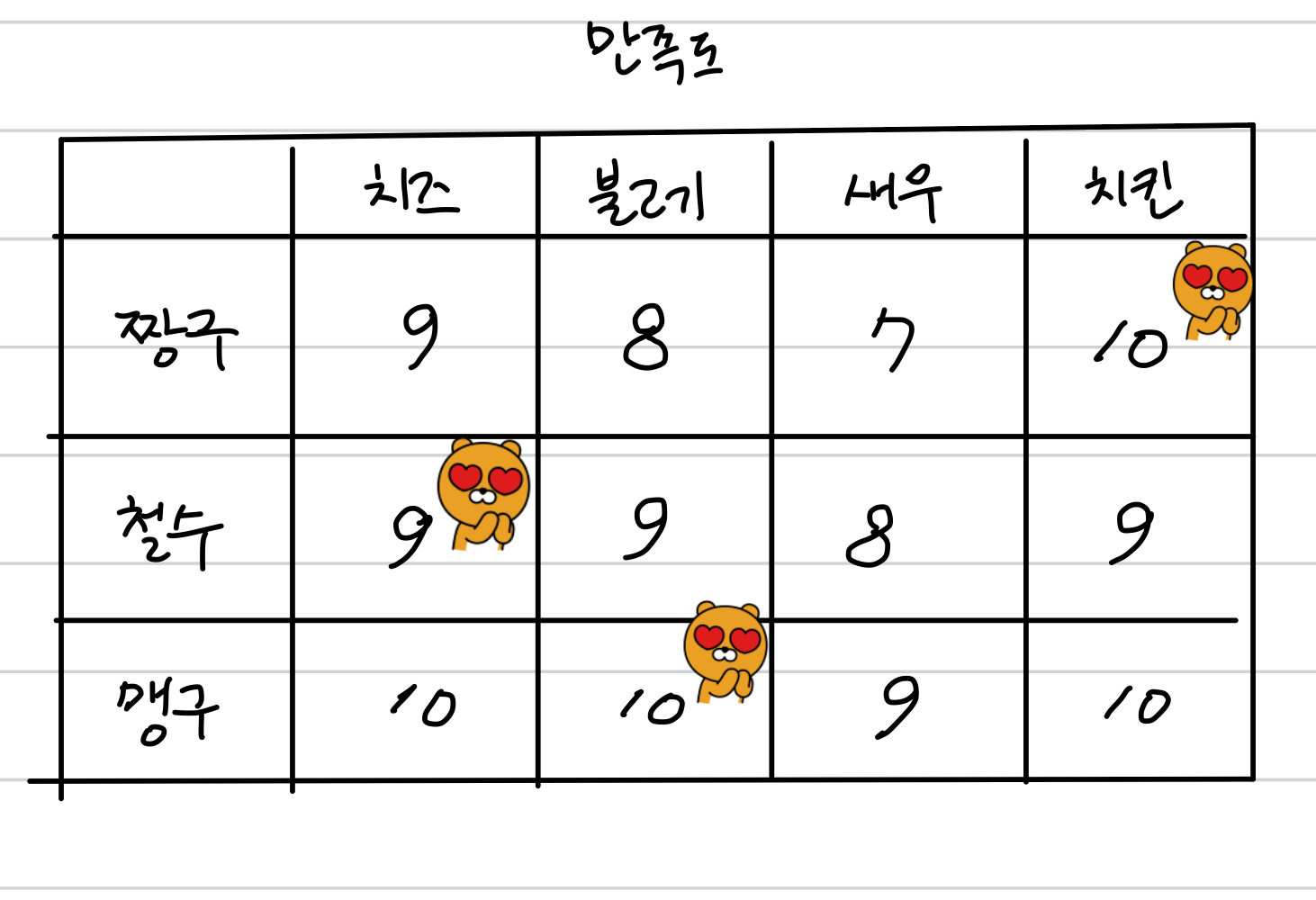 그런데 그 친구들의 각 햄버거를 좋아하는 정도는 다음과 같습니다.