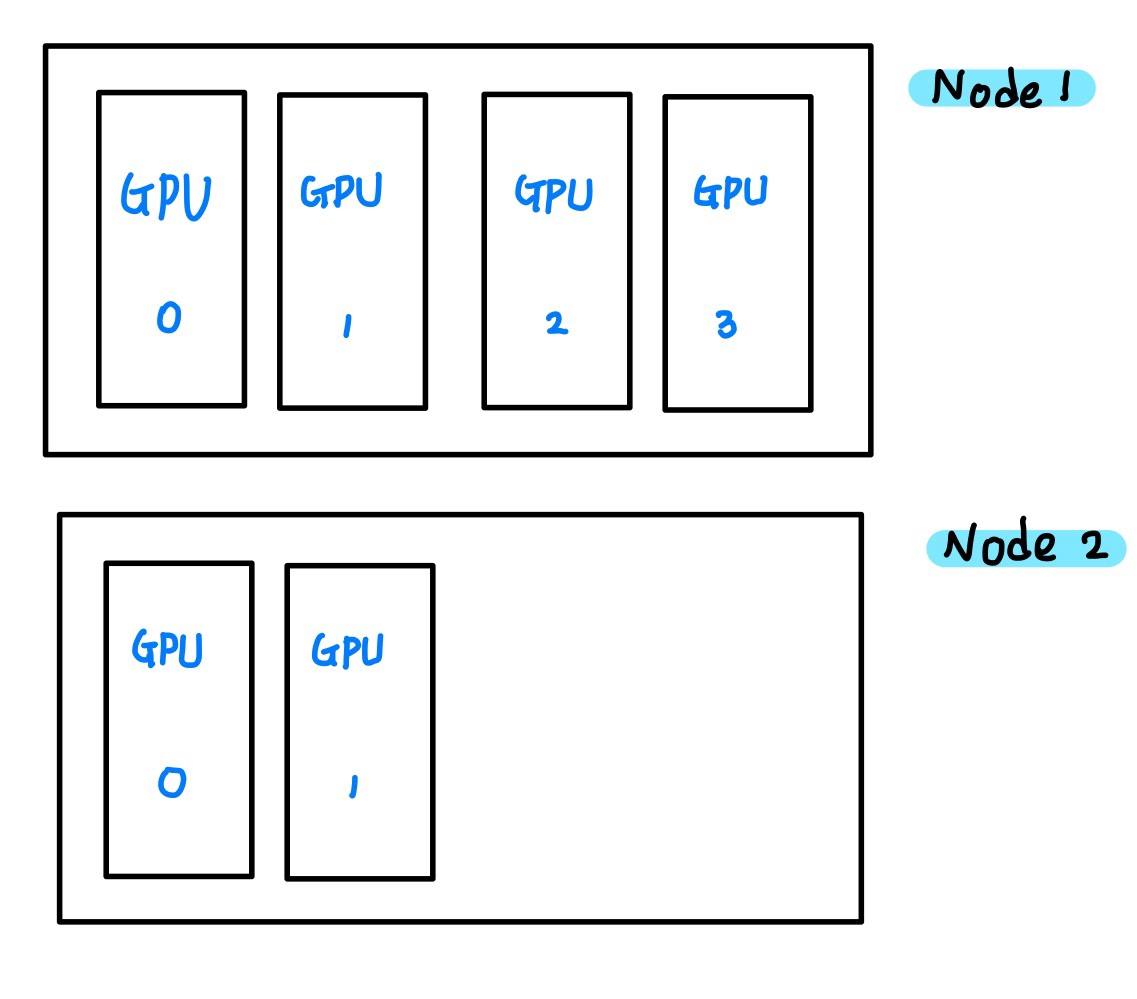 node1에는 gpu가 4개 있고, node2에는 gpu가 2개 있는 2개의 머신입니다.