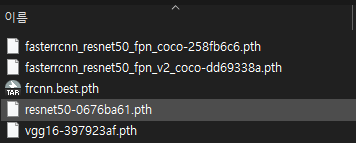 현재 제 torch.hub.get_dir() + "\checkpoints" 폴더에 들어있는 파일은 다음과 같습니다.