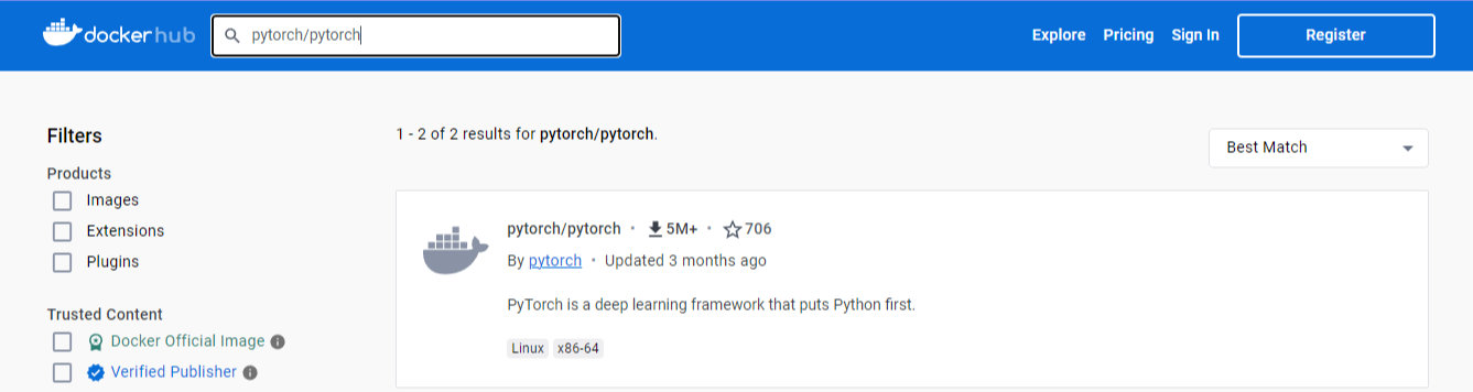다음 사이트에 접속을 하여서 pytorch/pytorch 를 검색하여 가장 위에 나오는 docker image를 pull 해 보겠습니다.